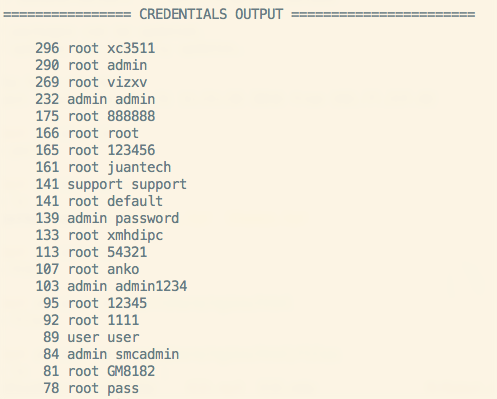 I’m not sure what we can infer from the top, say, five credentials are being used. Perhaps that there are more of them. Perhaps that there are more vulnerable versions of the devices that those creds are associated with. Maybe nothing. It’s something I’ll probably look at closer when I have time.