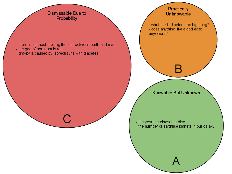 Many are confused about the meaning of agnosticism as it relates to things we as humans are not certain about. The common mistake is combining things we don’t know yet (A) with those that are probably unknowable (B) with those things that are ridiculous (C).
