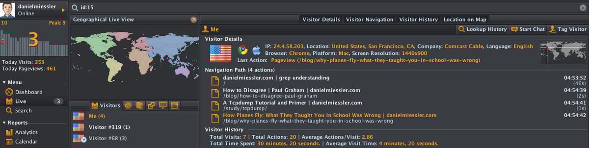 Something about realtime web analytics is just cool to me. I think it’s the idea of visualizing the interactions with distant objects. Well, people in this case. I think it’s like why guys like laser pointers–it allows you to touch things that are far away.