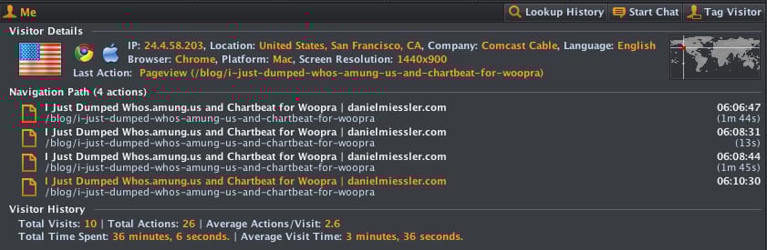 Realtime ChatThis one is downright spooky. As you’re looking at a visitor (which you can tag), you can elect to chat with them, and it’ll spawn a window in their browser coming from you. You can also enable an option to have site users chat with each other.